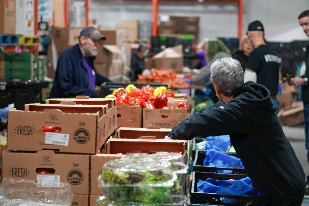 Volunteers pack fresh hampers inside The Food Bank’s distribution centre.